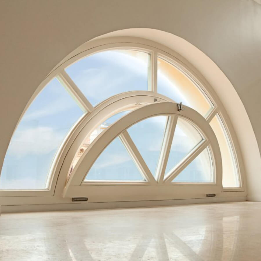 Окна со сложной геометрией смотрятся изыскано и красиво, но нужно учитывать то, что стоимость их выше, чем на обычные окна. К тому же срок производства их будет больше, это можно объяснить тем, что этот процесс достаточно трудоемкий, и требует больше времени и специального оборудования. Чаще всего такие окна делают глухими, но этот совсем не обязательно. Мы можем сделать открывание створок под разными радиусами и углами.